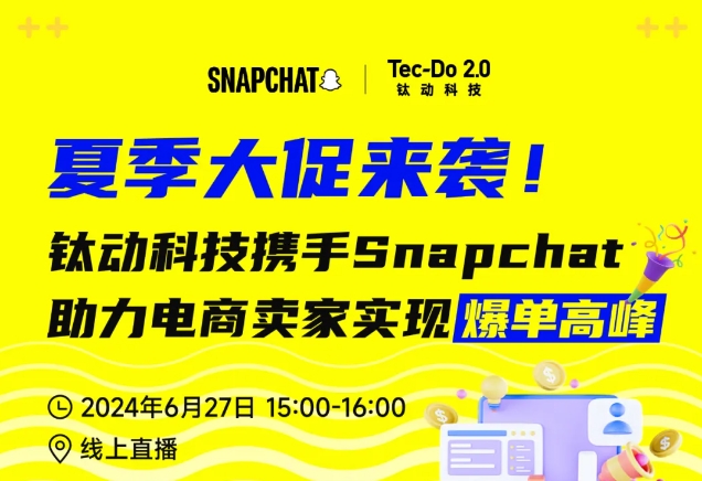 为了帮助电商企业抓住年中狂欢季这一重要节点,实现电商出海的销售与业务增长,钛动科技与Snapchat携手打造了一场助力电商卖家实现爆单高峰的线上直播活动。本次活动将汇聚电商、出海营销行业的专家,共同探讨电商出海的新机遇和挑战,分享最新的市场趋势、投放策略以及成功案例,帮助大家更好地把握市场脉搏,实现业务增长和品牌提升,共同书写电商出海新篇章!
